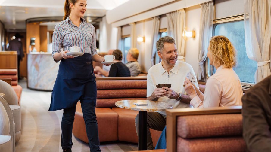 Your Gold Premium experience elevates rail travel to an art form. By day, your private cabin serves as an elegant retreat; by night, it transforms into a cosy sleeping sanctuary. The exclusive Gold Premium Lounge beckons with its sophisticated ambience, where you'll swap stories with fellow travellers over premium Australian wines. In the dining car, each meal becomes a celebration of regional flavours, from hearty breakfasts to four-course dinners showcasing the finest local ingredients.