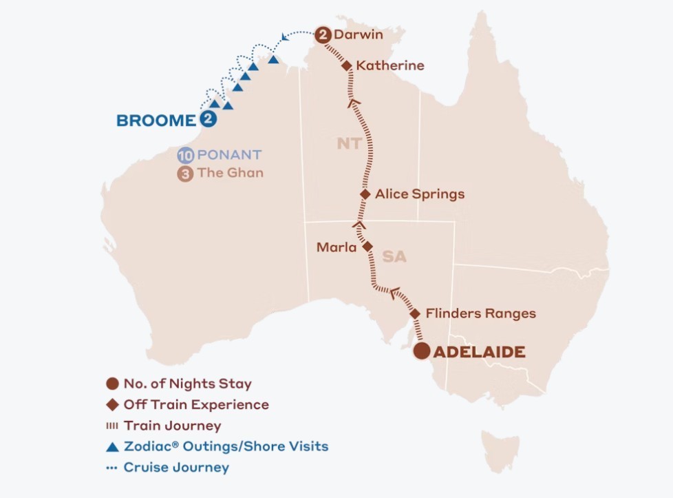 *From prices displayed are based on the Advance Purchase Holiday fare travelling in a Gold Twin on The Ghan and balcony stateroom Ponant cruise. Save up to prices are based on the difference between the Advance Purchase Holiday fare and the Everyday Fare. Advance Purchase Holiday fares are subject to availability and must be booked at least 6 months prior to travel.
