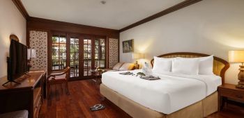 Indulge in the spacious grandeur of this room, boasting plush bedding, a private balcony with lush garden, lagoon or pool views and a luxurious ensuite bathroom, complete with a bathtub.