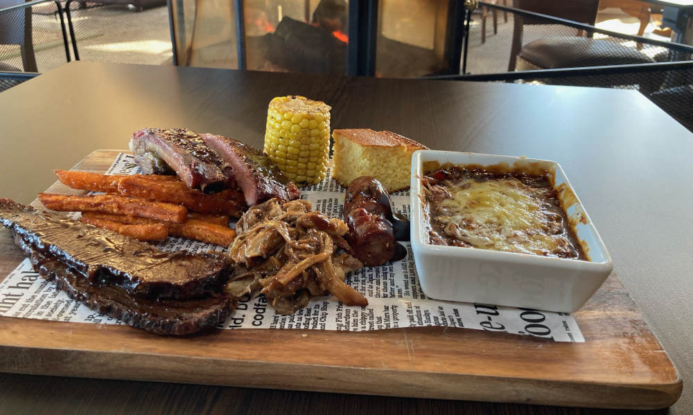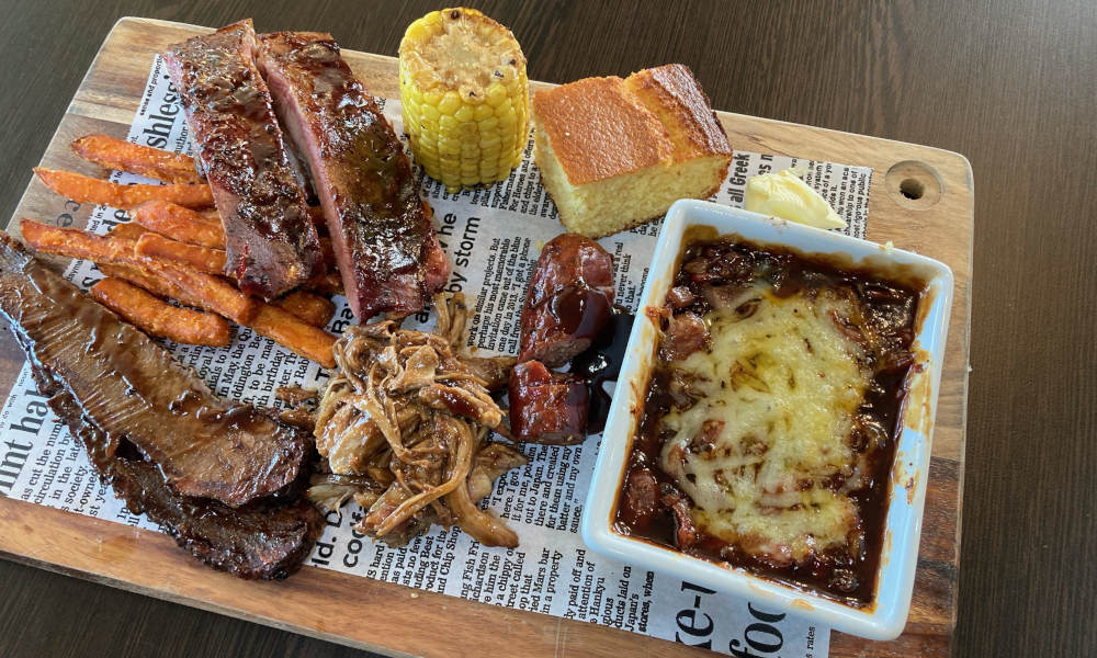 Enjoy a Texas BBQ platter of house-made and house-cured meats plus sides of seasonal local produce. Includes a glass of wine each from the Bellarine Estate.