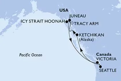 Your first stop, Ketchikan, is Alaska's salmon capital and a living gallery of Indigenous culture, where totem poles line the waterfront and floatplanes buzz overhead. At Icy Strait Point, keep your eyes peeled for humpback whales and brown bears in their natural habitat — this is Alaska at its most raw and remarkable. The highlight of the voyage comes as MSC Poesia glides deep into Tracy Arm, a dramatic fjord of sheer granite walls and thundering glaciers calving into impossibly blue water — a sight that will stay with you long after you've returned home.