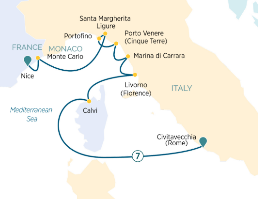 Welcome on board this eight-day luxury yacht cruise from the South of France to Italy, where you’ll discover the heart of the Western Mediterranean. Along the way, glimpse dramatic cliffs topped with elegant Italian villas, savour some of the freshest seafood in the world, and stroll cobblestone streets lined with bars, gelaterias, and designer boutiques. Stop in Monaco to soak up the fascinating culture, centuries-old royal history and glittering celebrity lifestyle. Visit Porto Venere, beloved home to numerous artists, and Marina di Carrara, famed for its pure white Carrara marble.