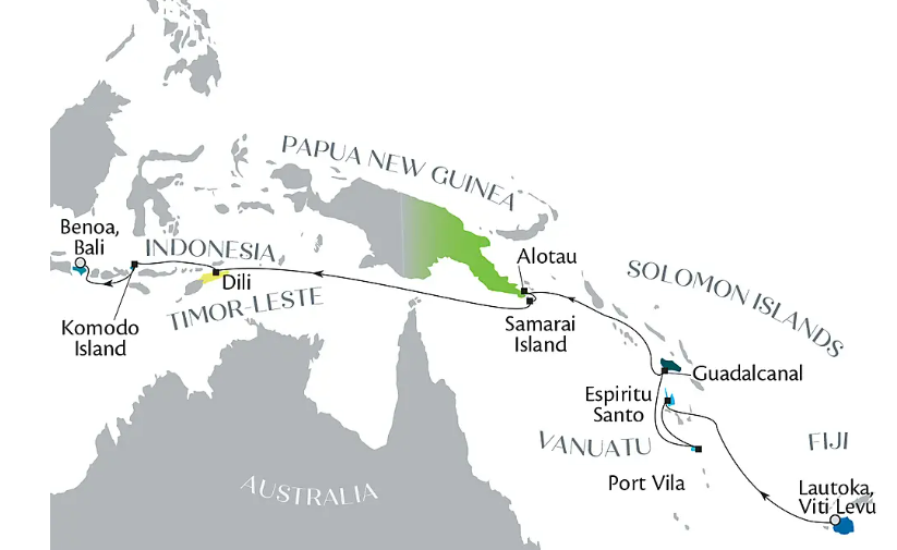 Departing from the Fijian port of Lautoka, PAUL GAUGUIN Cruises invites you on an extraordinary 21-day odyssey through seven stunning South Sea nations. Aboard the Paul Gauguin—a vessel purposefully crafted with a shallow draft to navigate translucent lagoons—you will experience an authentic Polynesian atmosphere while venturing toward the wild frontiers of Vanuatu, the Solomon Islands, Papua New Guinea, East Timor, and Indonesia.