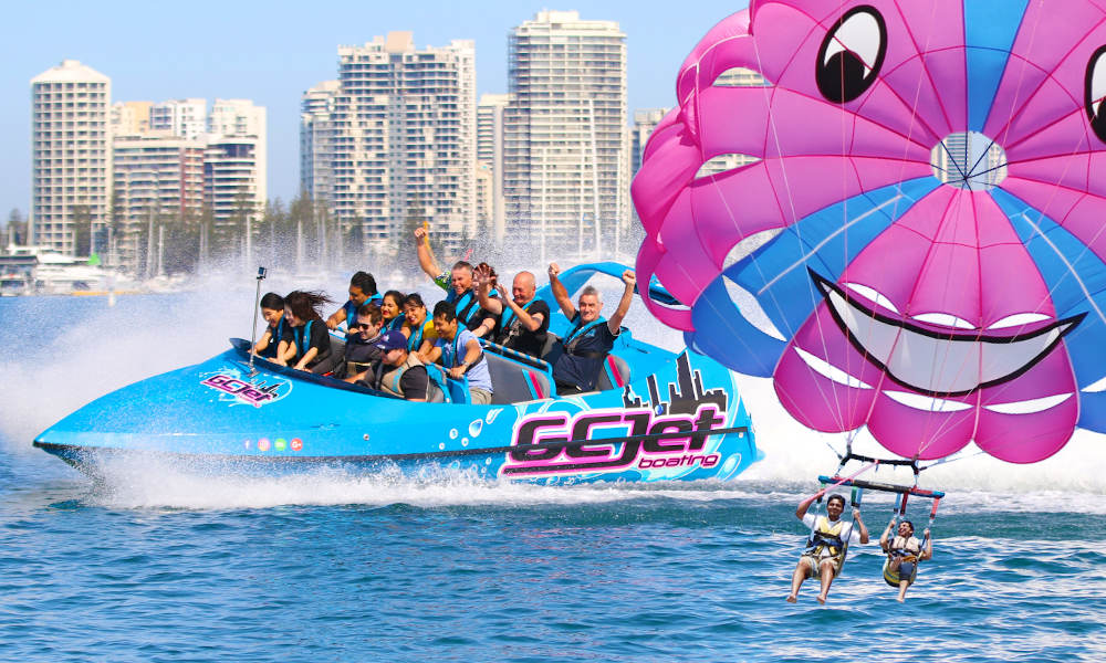 Fly high above the Gold Coast Broadwater on a 350 ft parasail flight plus a 30 minute high speed jet boat ride.