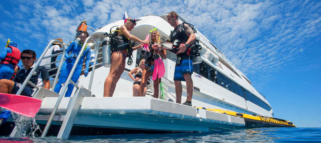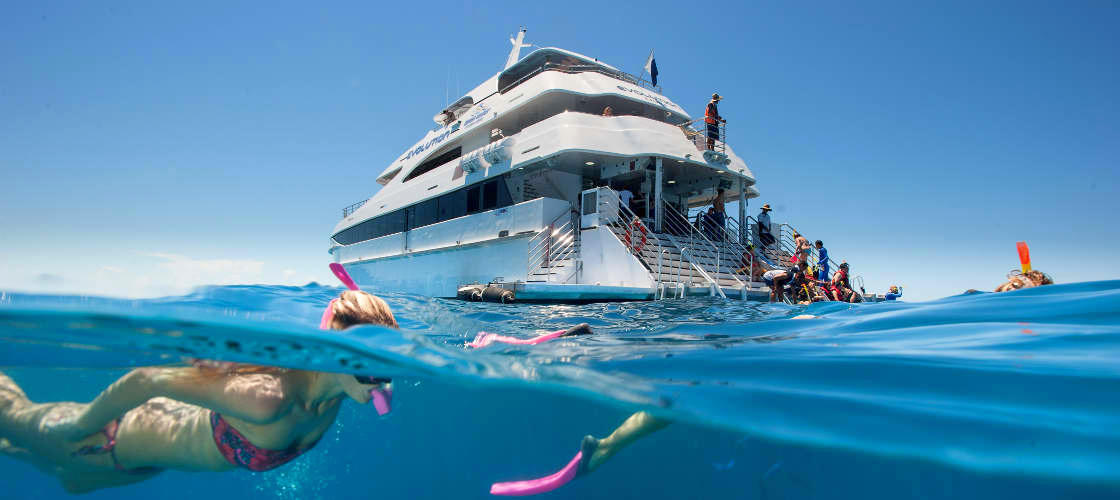 Your reef tour from Cairns includes a luxury cruise to the Outer Great Barrier Reef where you will visit two different reef sites. Morning tea is provided for you and cheese and biscuits will be served with a complimentary glass of wine on the return cruise. A hot and cold buffet lunch is also served with seafood selections where you can enjoy on the sundeck surrounded by the beautiful reef. The use of snorkelling equipment is included during your visit to the reefs so that you can experience the coral gardens and vibrant marine life or you can simply relax on the sundeck and enjoy the fact that you are hanging out on one of the natural wonders of the world.