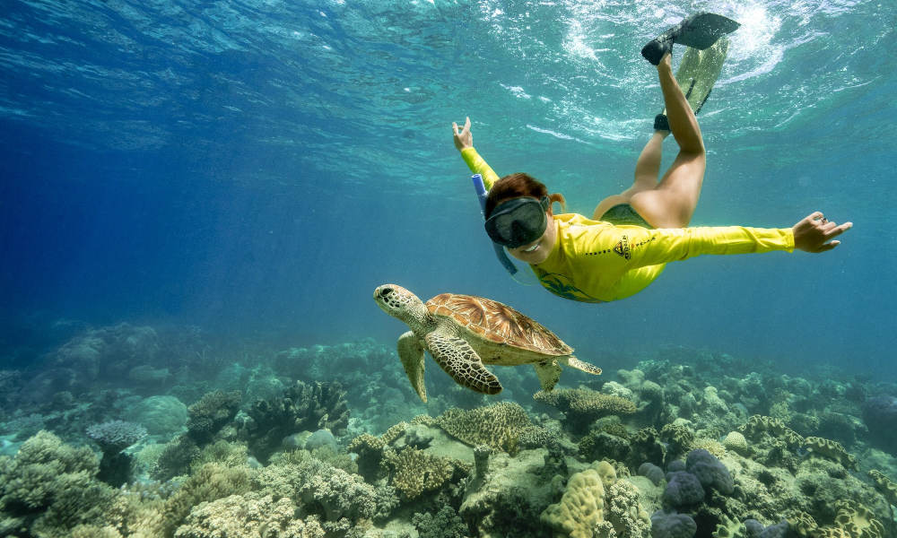 whilst snorkelling the Great Barrier Reef alongside sea turtles, which are found in