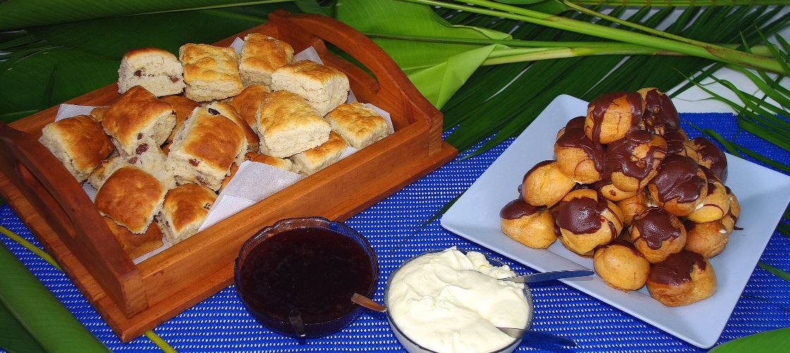 Morning tea is served on the journey out and consists of hot scones jam and cream and profiteroles. Tea, coffee and filtered water is available all day.