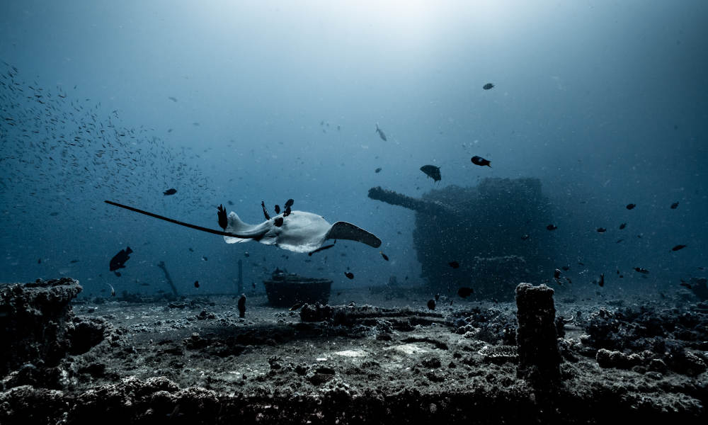 Explore the outside of the wreck and encounter an abundance of local aquatic sea life that inhabits her. Discover the depths of her hull, enter the engine room or even visit the control room where her kill switches are still intact.