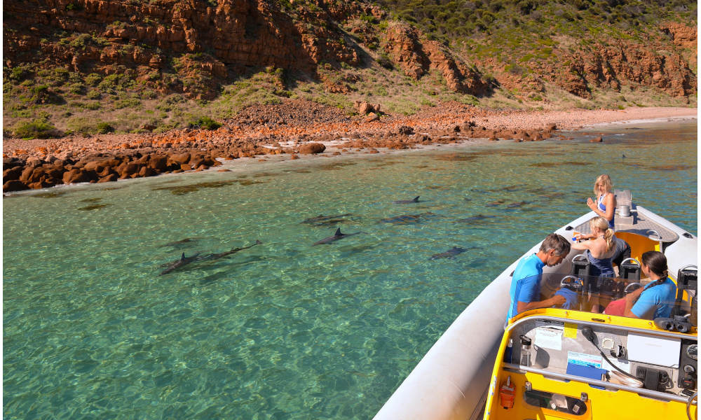 Embark on a journey of wonder and connection as you share the water with our friendly dolphins. Our Swim with Dolphin experience is more than a moment; it's a memory etched in the waves of the ocean. The tour is the only true wild dolphin swim on Kangaroo Island and is the perfect way to see some of the amazing wildlife that inhabits this island paradise. We are the only operator on the island that guarantees a dolphin swim experience and a dolphin swim experience can't be rushed - that's why we give our guests plenty of time on our tours. During the tour, you'll have the opportunity to swim with wild dolphins, listen in on them using our hydrophone, you may see seals, sea eagles, and osprey from the boat. You'll also get to view ancient fossil beds and learn about the fascinating history of Kangaroo Island.