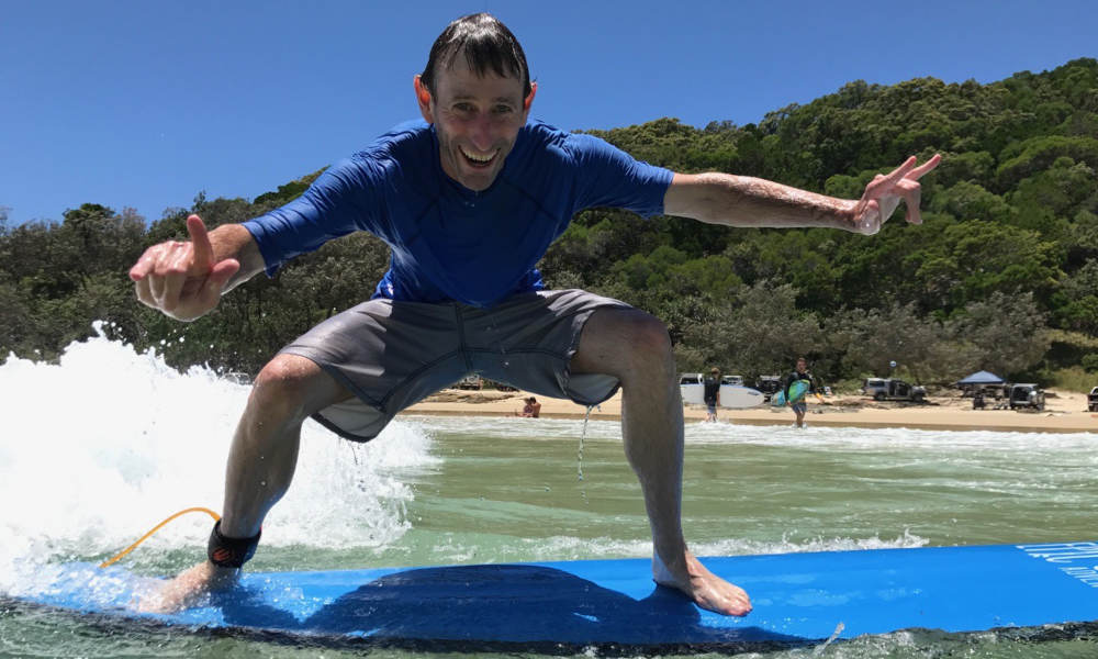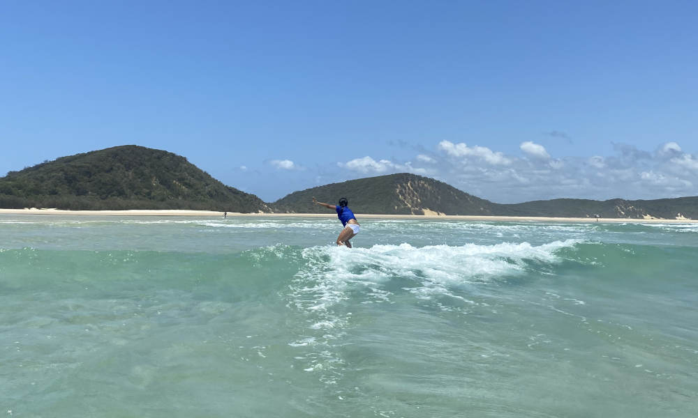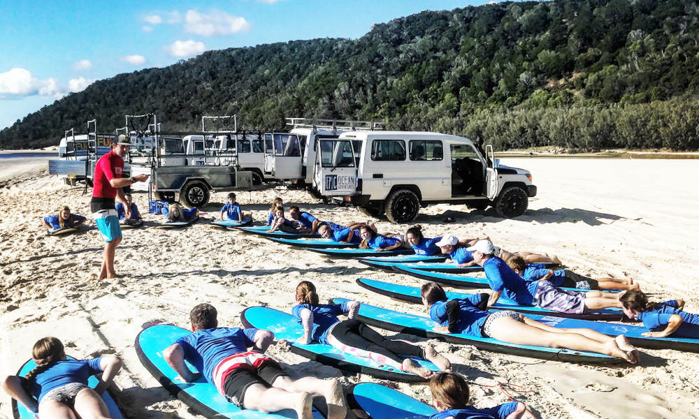 Learn to surf at Sunshine Coast's hidden surfing paradise, only accessible by 4WD vehicles through the Great Sandy National Park.