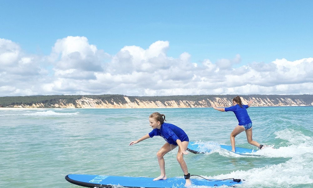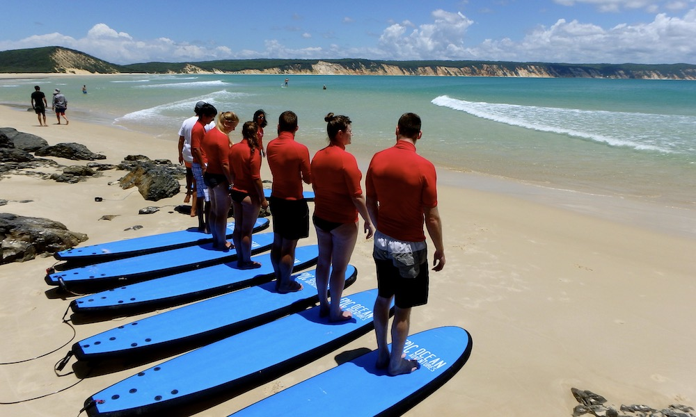 Have you ever wanted to learn how to surf? Come along and join this full day surfing adventure from Noosa and learn to ride Australia’s longest waves at picturesque, uncrowded beaches at Double Island Point. This surfing adventure begins with a scenic 4WD adventure via the Noosa North Shore ferry to Teewah Beach where you will driven along remote beaches in the Great Sandy National Park to Double Island Point. Experienced surf instructors will provide you with personalised attention to get you up on you feet riding a wave in the surf. You may even spot wildlife such as Bottlenose Dolphins, Humpback Whales, turtles and rays throughout the day. Light snacks and refreshments are provided for you before you enjoy a spectacular 4WD along the beach on your return journey back to Noosa. Learn to surf at one of the most beautiful beaches in Australia. Book your Noosa surfing adventure online here!