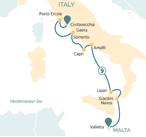 Your journey through the treasures of the Mediterranean begins at the seaport of Civitavecchia – gateway to Rome, the ‘Eternal City’. Continue your travels back in time as you immerse yourself in in the rich tapestry of ancient history at the archaeological sites in Gaeta. Discover the legendary island of Capri, where sweeping views will leave you in awe. Stroll the charming lanes of Anacapri, uncovering the hidden beauty and timeless allure of the island. Take in incredible vistas of the Bay of Naples from Sorrento, where dramatic cliffs, fragrant lemon groves and sunsets over the sea create lasting memories. Soak up rich history along the picturesque streets of Amalfi, relax on the pristine beaches of Lipari and explore the charming town of Giardini Naxos on the stunning island of Sicily. Whether you seek relaxation, adventure, historical wonders, or cultural immersions, this luxury cruise offers something for everyone.