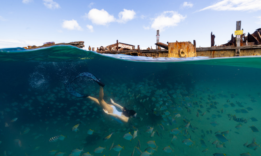 Departing daily from Brisbane, cruise in luxury to Moreton Bay Marine Park aboard the modern, air-conditioned catamaran Spirit of Migaloo II. Here enjoy the freedom to do as much or as little as you please with all activities included and no local fees. Dive in and snorkel the fifteen shipwrecks deliberately sunk just off the coastline with an abundance of spectacular coral formations and colourful marine life that needs to be seen to be believed. No experience is required, and all equipment and water safety are provided. Afterwards, join our naturalist guides in a fish-feeding session with the 200 species that frequent the area.