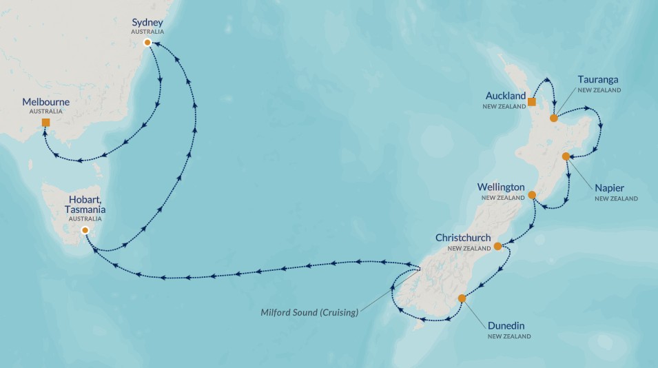 Crossing the Tasman, Hobart charms with its Georgian waterfront and the wild heights of Mount Wellington, before your journey reaches its spectacular finale — New Year's Eve on Sydney Harbour, as the city's legendary fireworks paint the sky. From there, a final sail brings you into Melbourne, cosmopolitan and creative, the perfect city to end an unforgettable summer voyage.