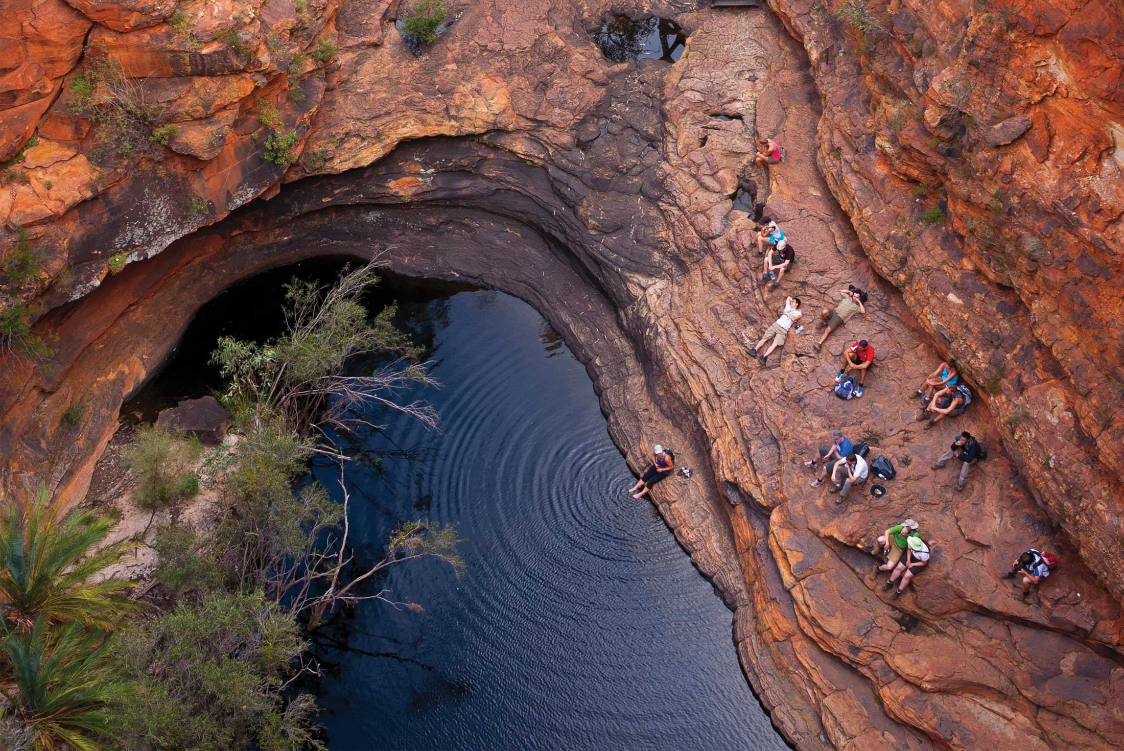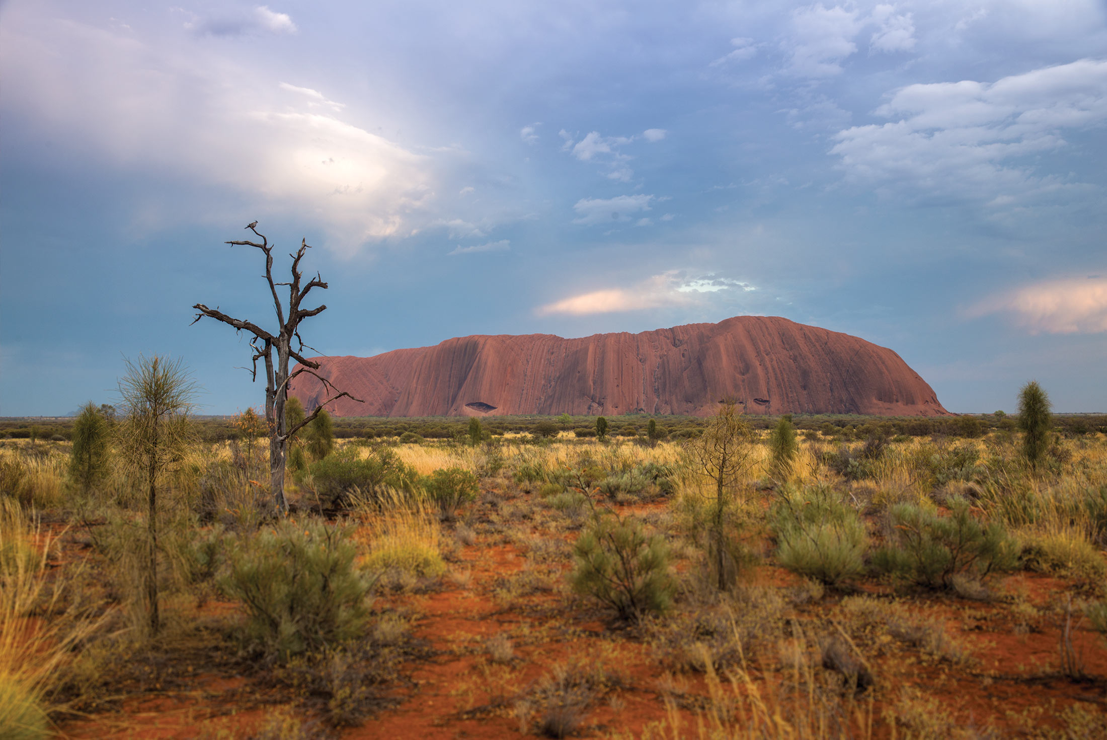 Wake early to catch an unforgettable Uluru sunrise, then get a closer look at this massive sandstone monolith on an unguided walk around its base. After your stroll, walk to the cave paintings near Mutitjulu Waterhole, where you will be met by an Anangu guide. Your guide will provide insight into the ancient rock etchings and the stories they tell, as well as the traditions of the First Nations people of this land. After this, visit the nearby Cultural Central to browse its extensive collection of Aboriginal arts and crafts. Enjoy a local lunch then set off on a 3-hour drive to your exclusive campsite within Watarrka National Park (Kings Canyon). Get acquainted with your surroundings, enjoy dinner onsite and settle in for the night.