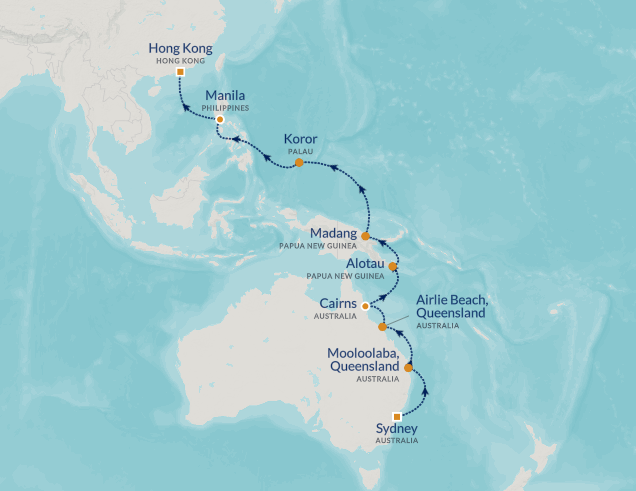 Set sail from Sydney on an unforgettable 21-night voyage to vibrant Hong Kong, exploring breathtaking coastlines, tropical paradises, and fascinating cultures. Cruise the stunning Queensland coast, with calls at Mooloolaba, Airlie Beach, and an overnight stay in Cairns—the gateway to the Great Barrier Reef. Continue to Alotau and Madang in Papua New Guinea, where lush landscapes and rich traditions await.