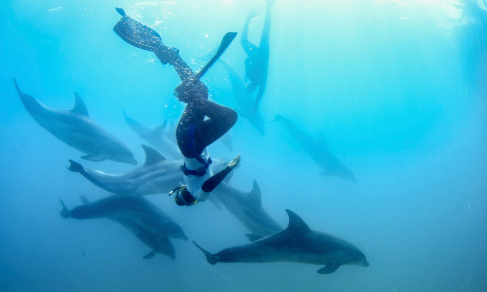 Once back on-board we serve lunch, ensuring you’re energised and ready for our next snorkel. Once the dolphins are located we observe their behavior and location before we approach the pod. In small groups of 10, we slide into the water, floating on the surface. We wait, for the dolphin's squeaks and whistles to get louder, a sign that they will join us and swim. Each encounter is totally unique, sometimes they will swim around us for endlessly other times they will glide past for a look and continue swimming, We spend as much time as possible swimming and sightseeing but need to ensure we are not changing their behavior or lifestyle.