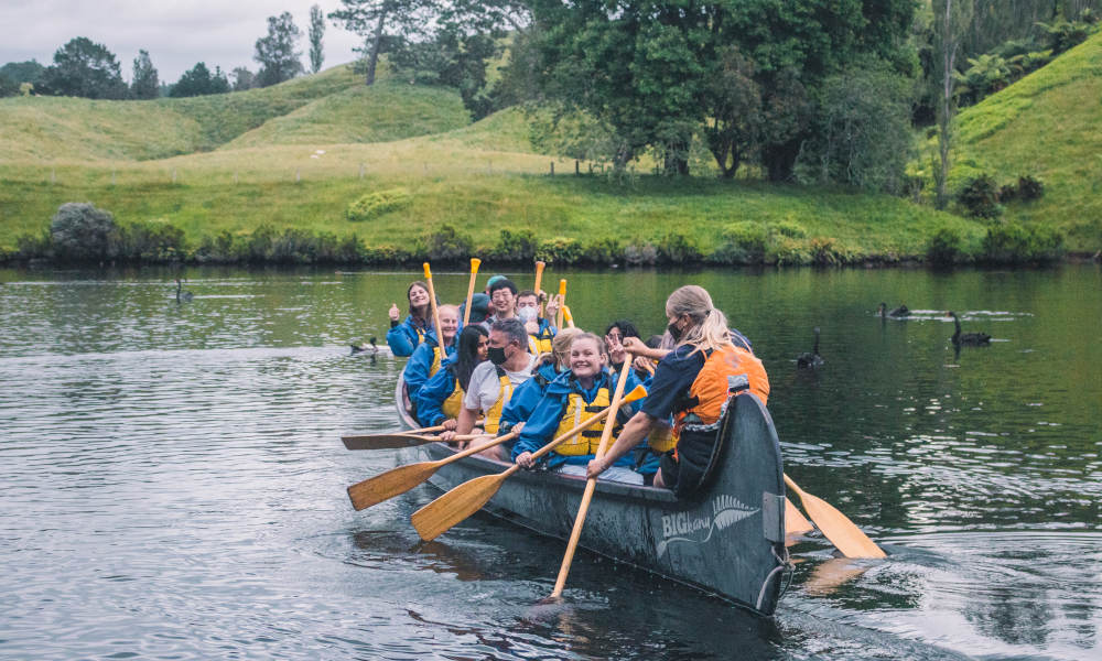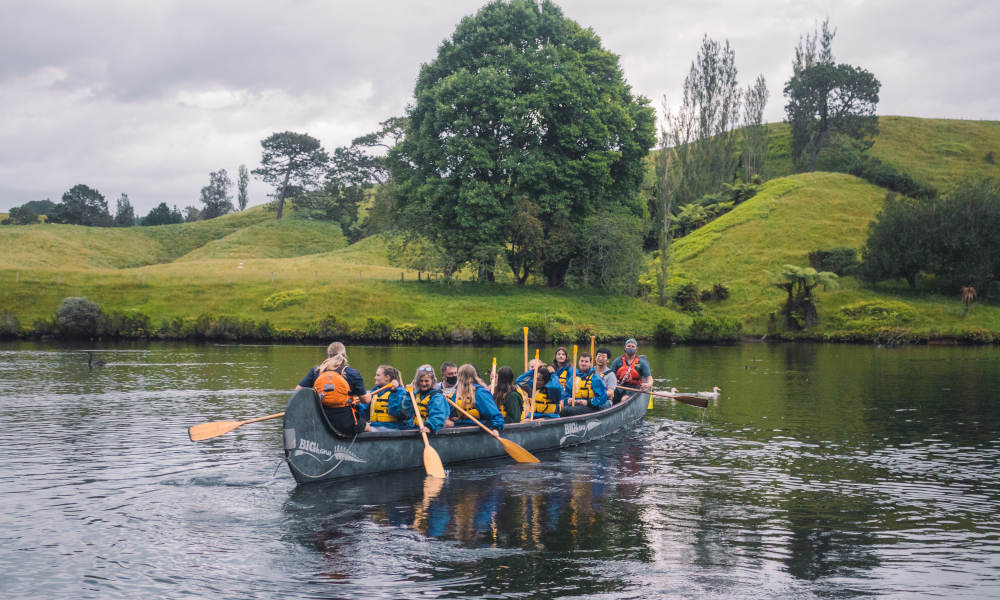 Launch the Big Kanu from the lakes edge and paddle together through the calm waters towards the head of the lake