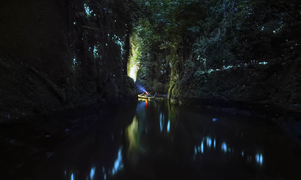 Paddle on your kayak into the night and discover the magic of the enchanting glow worm canyon