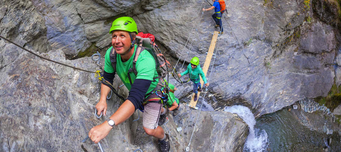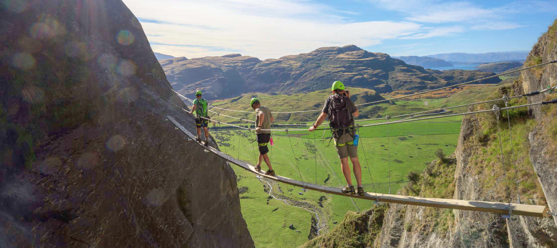 The whole experience lasts for around 3-hours, 1-hour of which is climbing, and features wire bridge crossings, hidden pools and scenic picnic spots as well as a return journey via trail before you begin the return journey to Wanaka. The climb itself Via Ferrata and is aided by metal pegs secured into the rock wall, meaning you won't have to worry about trying to grip bare rock. This makes the whole experience easier and more enjoyable for everyone.